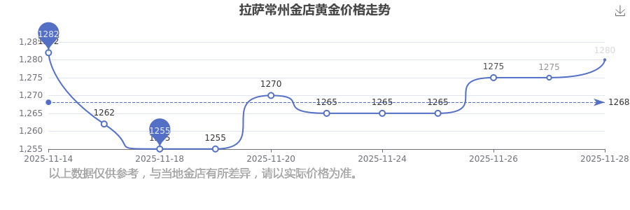 2025年11月29日拉薩常州金店黃金價格:1280.0元/克。