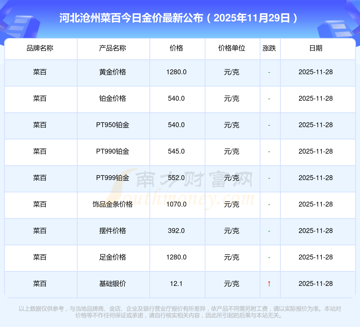 以上數(shù)據(jù)僅供參考,與當(dāng)?shù)仄放粕、金店、企業(yè)及銀行營業(yè)廳報價有所差異,依產(chǎn)品不同需另附工費(fèi),請以實(shí)際報價為準(zhǔn)。本站對價格等不作任何保證或承諾,請自行核實(shí)相關(guān)內(nèi)容,因此所引起的后果與本站無關(guān)。
