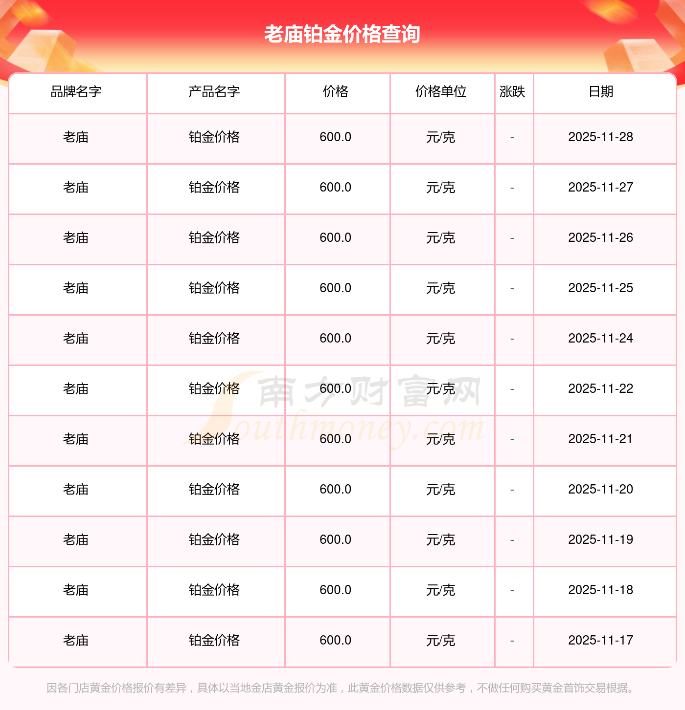 今日老廟 鉑金價(jià)格最新的克重售價(jià)為600.0元/克。