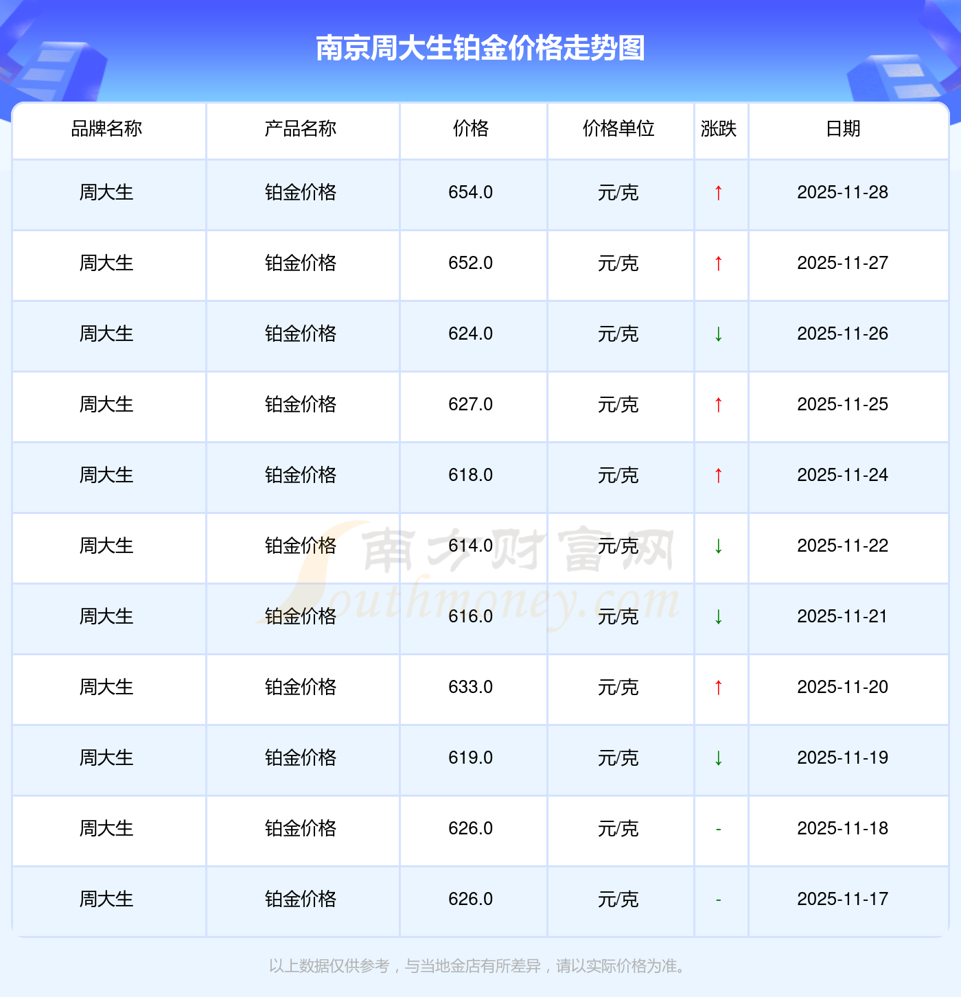 2025年11月29日南京周大生鉑金價格為654.0元/克。
