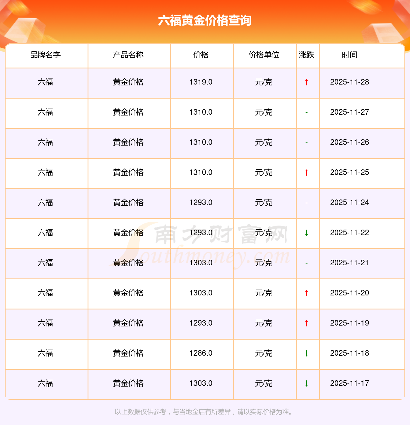 2025年11月29日六福黃金價(jià)格是1319.0元/克。