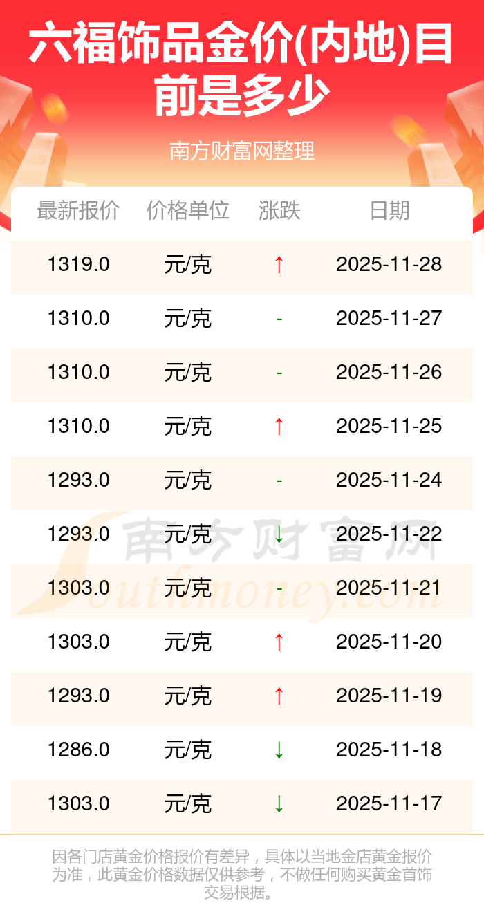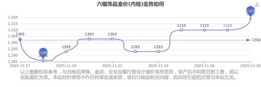 今日六福飾品金價(內(nèi)地)最新查詢:1319.0元/克。