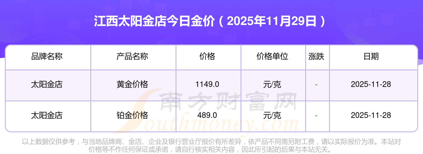 2025年11月29日江西太陽金店黃金按克計價,現(xiàn)在多少錢一克?黃金價格1321.0元/克,鉑金價格600.0元/克,銀條價格12.6元/克,黃金價格1321.0元/克,鉑金價格600.0元/克,金條價格(內(nèi)地)1207.0元/克,金飾價格(內(nèi)地)1321.0元/克,黃金飾品(香港)46370.0,鉑金飾品(香港)13970.0,金條金價(香港)41860.0,投資金條1296.0元/克。