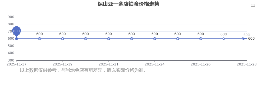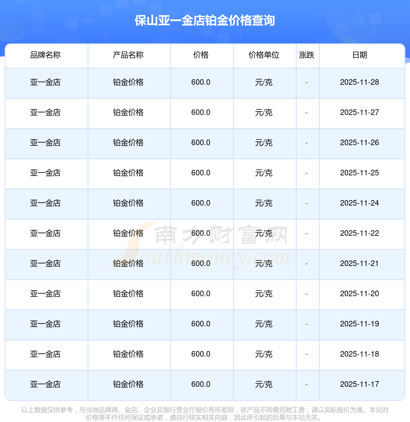 保山亞一金店在 2025年11月29日的鉑金價格零售價格為 600.0元/克。