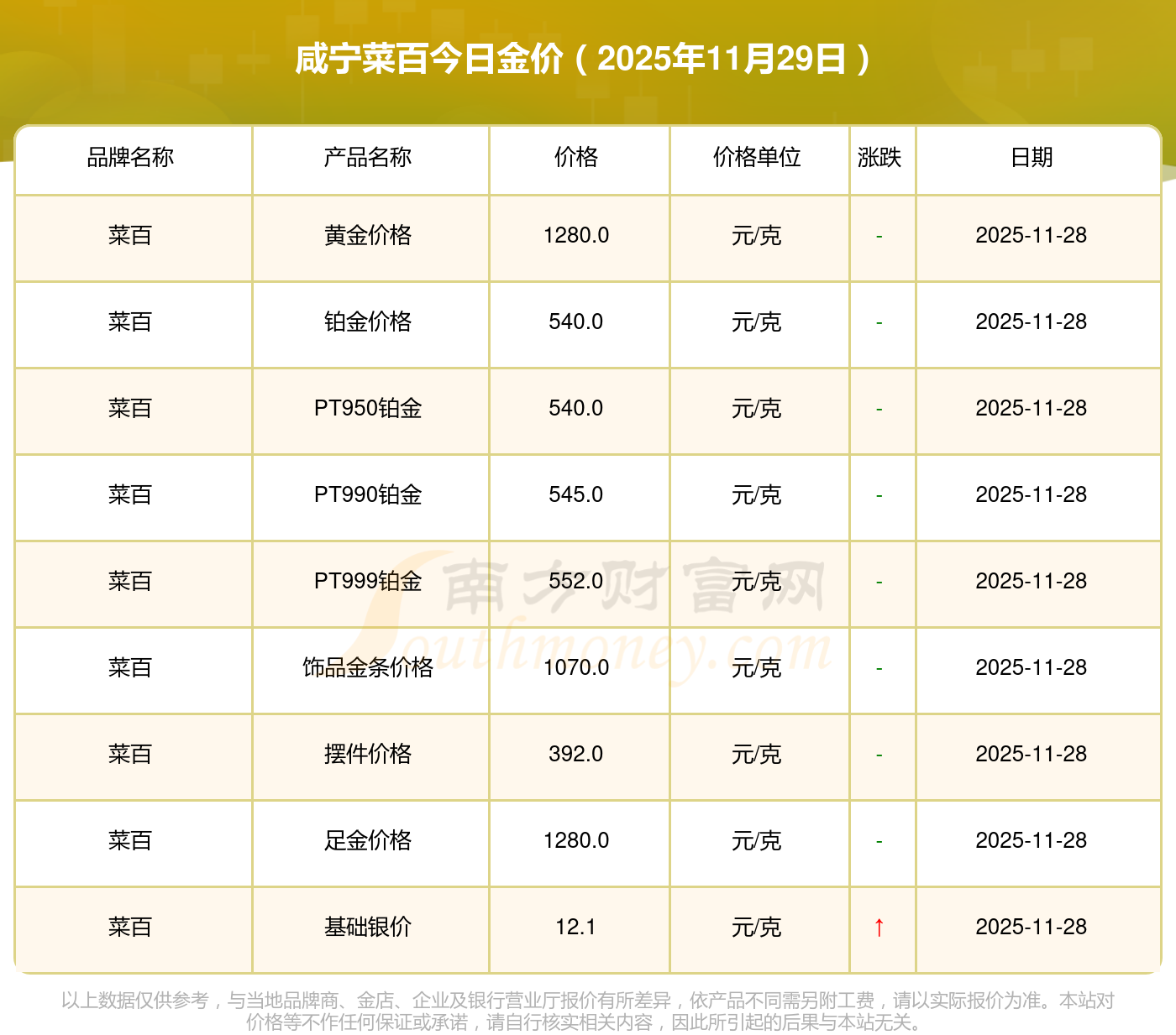 2025年11月29日咸寧菜百金價查詢:黃金價格1321.0元/克,鉑金價格600.0元/克,銀條價格12.6元/克,黃金價格1321.0元/克,鉑金價格600.0元/克,金條價格(內(nèi)地)1207.0元/克,金飾價格(內(nèi)地)1321.0元/克,黃金飾品(香港)46370.0,鉑金飾品(香港)13970.0,金條金價(香港)41860.0,投資金條1296.0元/克。