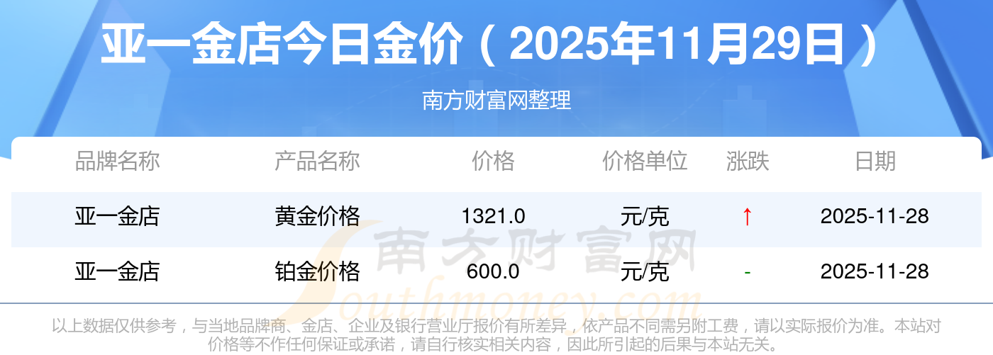 2025年11月29日,星光達珠寶、星光達珠寶、寶泉錢幣、金蘭首飾、金蘭首飾、謝瑞麟、謝瑞麟、謝瑞麟、謝瑞麟、謝瑞麟、金銀街等各大金店品牌黃金價格今日價格如下:星光達珠寶1321.0元/克、星光達珠寶600.0元/克、寶泉錢幣12.6元/克、金蘭首飾1321.0元/克、金蘭首飾600.0元/克、謝瑞麟1207.0元/克、謝瑞麟1321.0元/克、謝瑞麟46370.0、謝瑞麟13970.0、謝瑞麟41860.0、金銀街1296.0元/克。