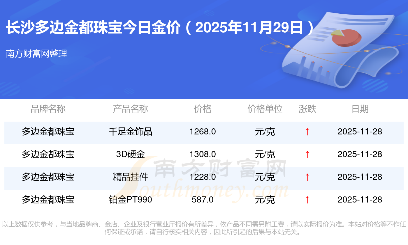 2025年11月29日長沙多邊金都珠寶黃金一克的市場行情價是多少?黃金價格1321.0元/克,鉑金價格600.0元/克,銀條價格12.6元/克,黃金價格1321.0元/克,鉑金價格600.0元/克,金條價格(內(nèi)地)1207.0元/克,金飾價格(內(nèi)地)1321.0元/克,黃金飾品(香港)46370.0,鉑金飾品(香港)13970.0,金條金價(香港)41860.0,投資金條1296.0元/克。