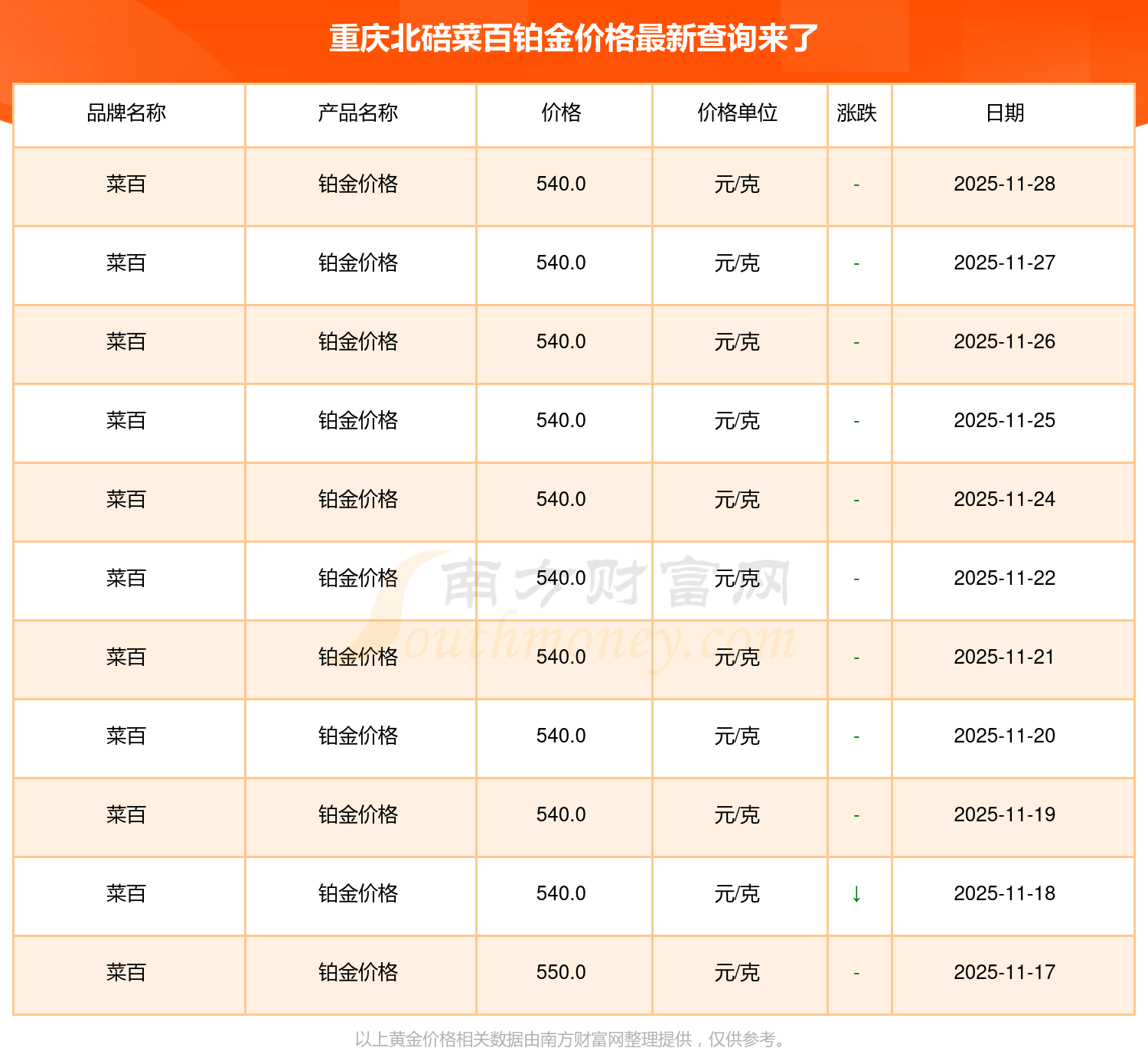 今日重慶北碚菜百鉑金價格查詢,(2025年11月29日)今日重慶北碚菜百鉑金價格是540.0元/克。