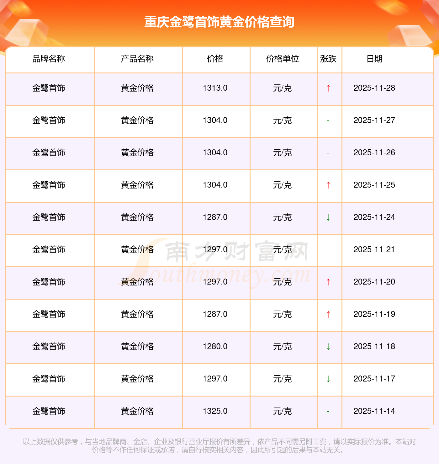 今日重慶金鷺首飾黃金價格的價格為1313.0元/克。