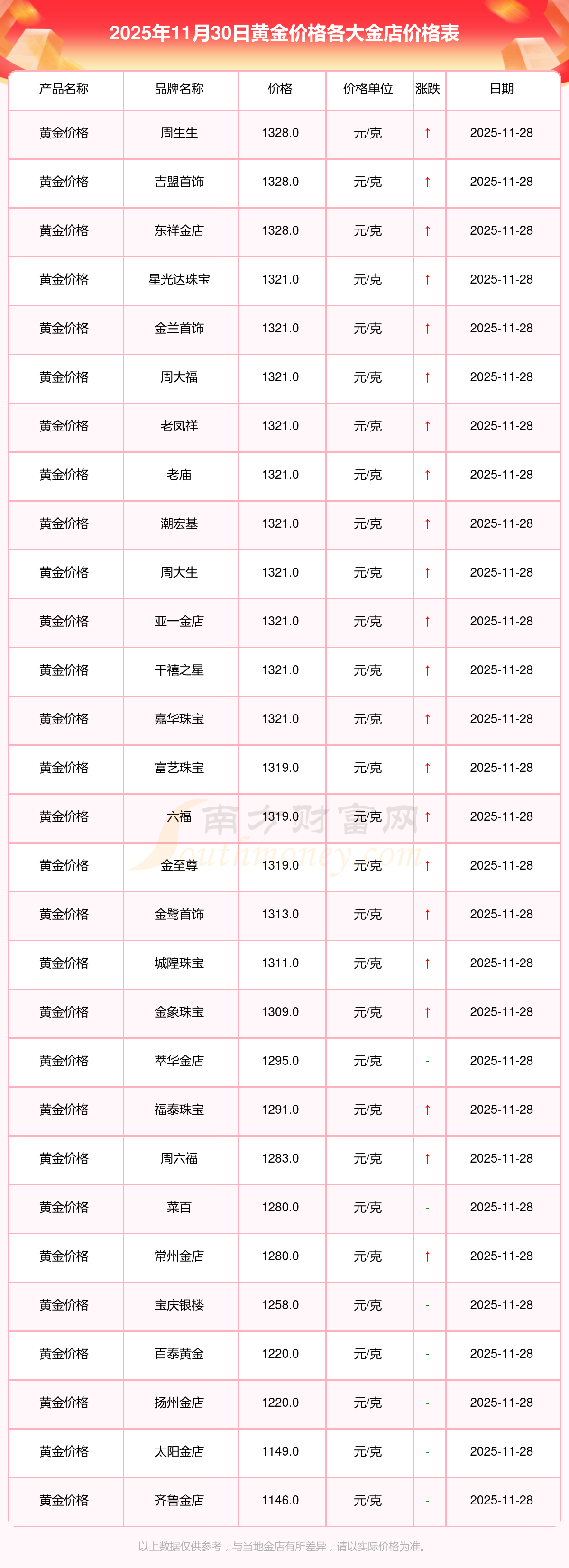 2025年11月30日各大金店黃金價格最新價格:星光達(dá)珠寶1321.0元/克,星光達(dá)珠寶600.0元/克,寶泉錢幣12.6元/克,金蘭首飾1321.0元/克,金蘭首飾600.0元/克,謝瑞麟1207.0元/克,謝瑞麟1321.0元/克,謝瑞麟46370.0,謝瑞麟13970.0,謝瑞麟41860.0,金銀街1296.0元/克。