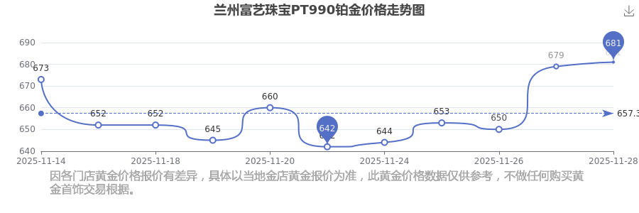 681.0元/克,這是蘭州富藝珠寶于 2025年11月30日所定的PT990鉑金價格。