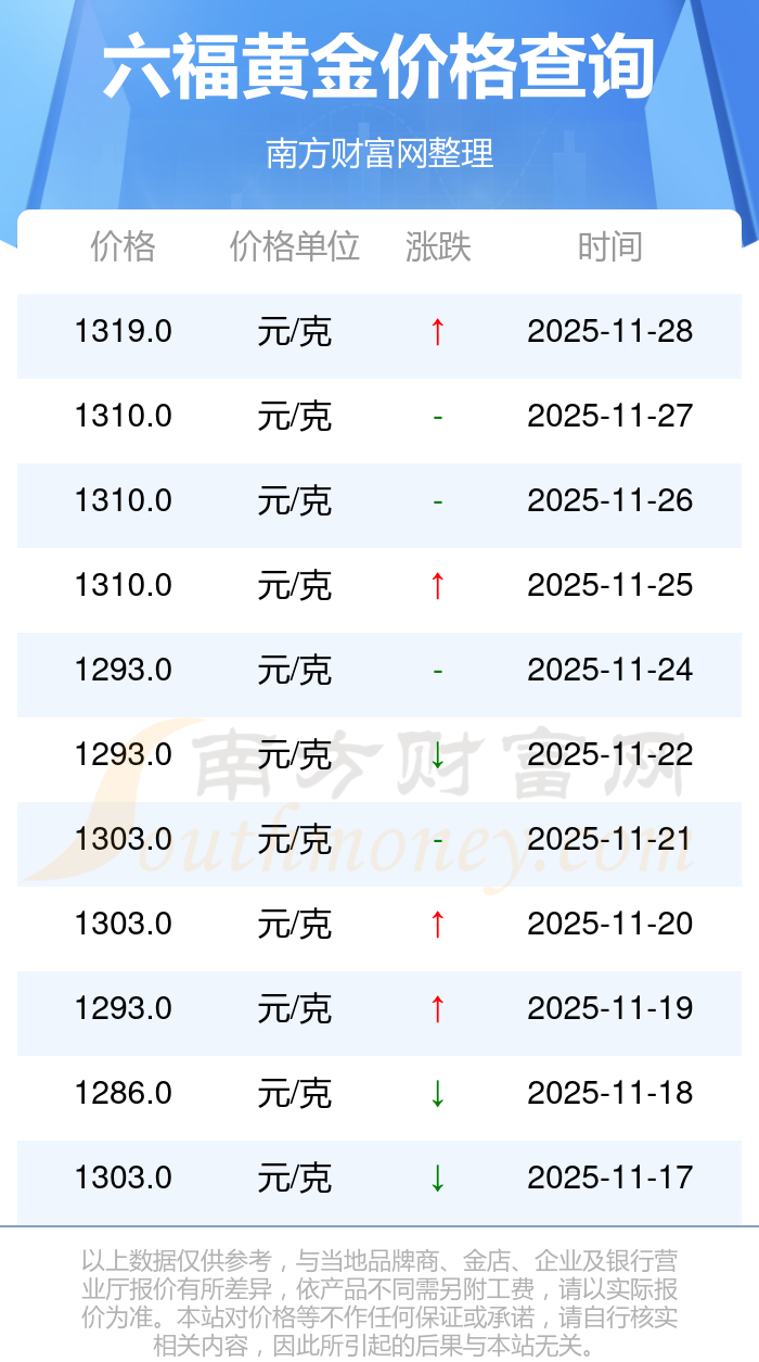 當(dāng)下,六福 黃金價(jià)格今日的最新價(jià)格是1319.0元/克。