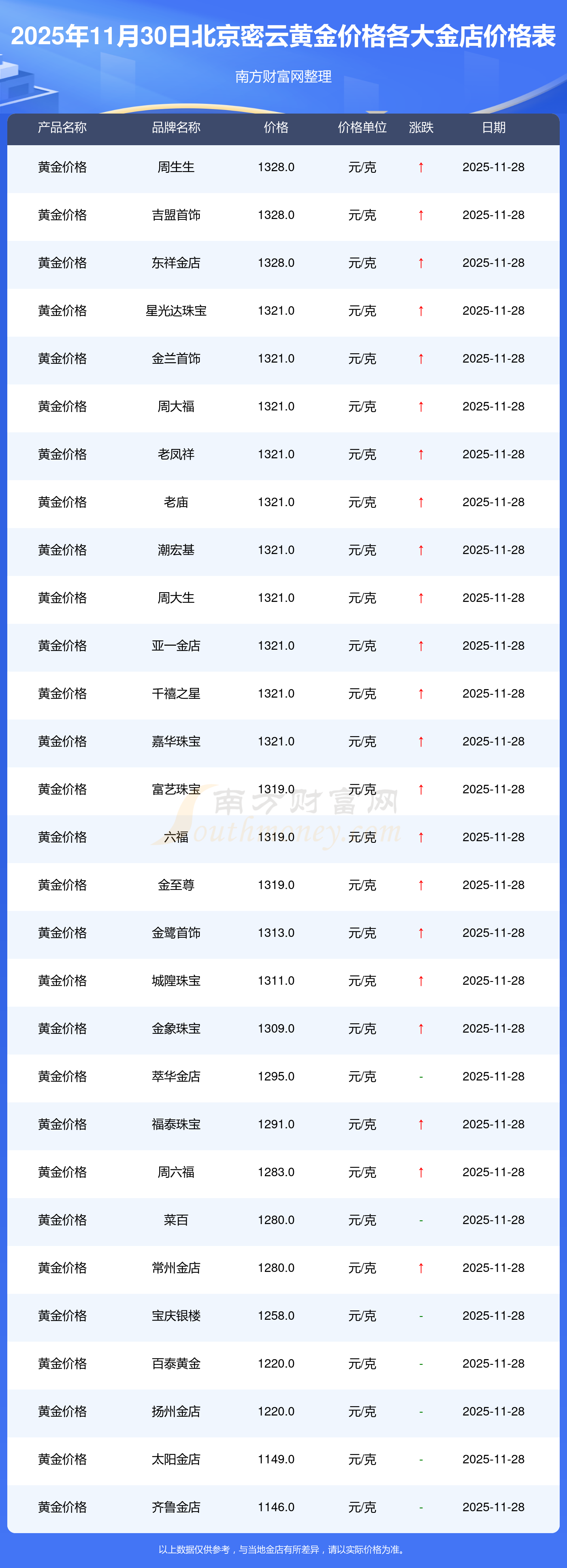 2025年11月30日,北京密云星光達(dá)珠寶、星光達(dá)珠寶、寶泉錢幣、金蘭首飾、金蘭首飾、謝瑞麟、謝瑞麟、謝瑞麟、謝瑞麟、謝瑞麟、金銀街等各大金店品牌黃金價(jià)格今日價(jià)格行情最新來了:星光達(dá)珠寶1321.0元/克、星光達(dá)珠寶600.0元/克、寶泉錢幣12.6元/克、金蘭首飾1321.0元/克、金蘭首飾600.0元/克、謝瑞麟1207.0元/克、謝瑞麟1321.0元/克、謝瑞麟46370.0、謝瑞麟13970.0、謝瑞麟41860.0、金銀街1296.0元/克。