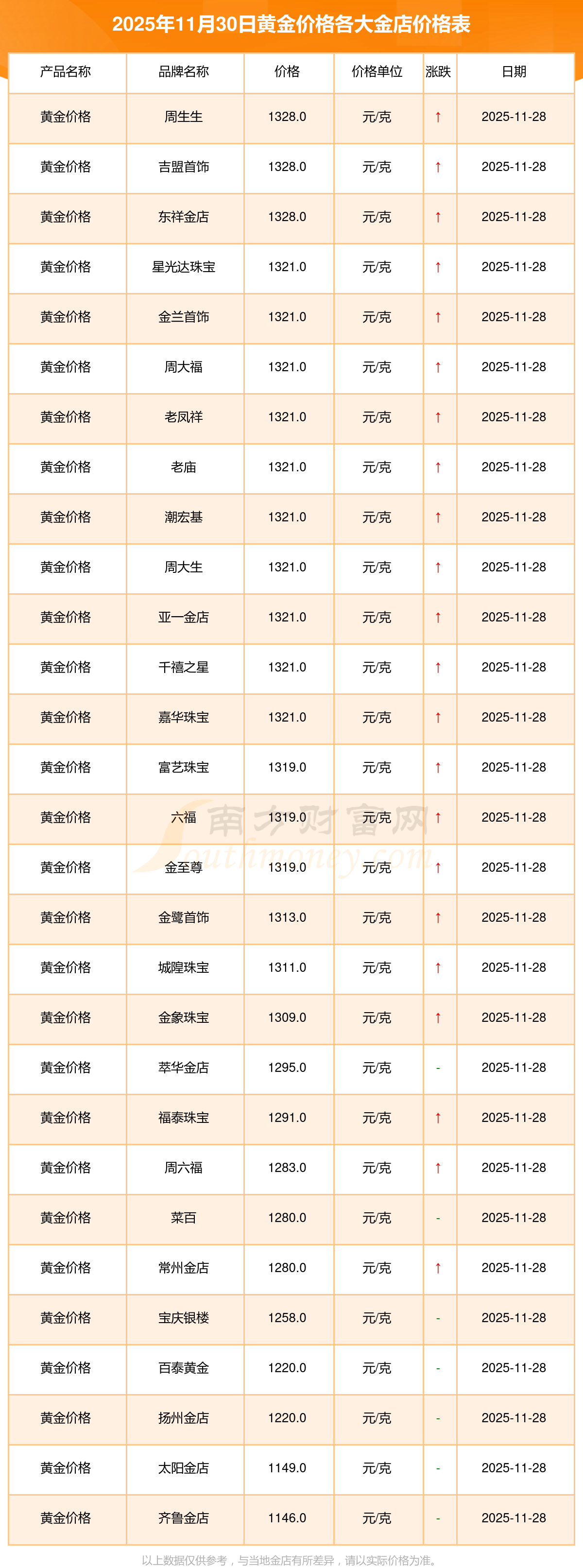 2025年11月30日星光達珠寶、星光達珠寶、寶泉錢幣、金蘭首飾、金蘭首飾、謝瑞麟、謝瑞麟、謝瑞麟、謝瑞麟、謝瑞麟、金銀街等各大金店品牌黃金價格最新價格如下:星光達珠寶黃金價格1321.0元/克,星光達珠寶鉑金價格600.0元/克,寶泉錢幣銀條價格12.6元/克,金蘭首飾黃金價格1321.0元/克,金蘭首飾鉑金價格600.0元/克,謝瑞麟金條價格(內地)1207.0元/克,謝瑞麟金飾價格(內地)1321.0元/克,謝瑞麟黃金飾品(香港)46370.0,謝瑞麟鉑金飾品(香港)13970.0,謝瑞麟金條金價(香港)41860.0,金銀街投資金條1296.0元/克。