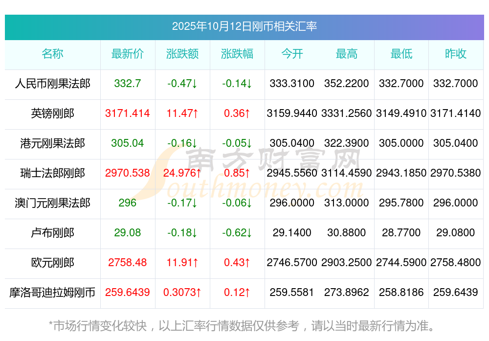 剛幣對(duì)韓元匯率行情一覽表(2025年10月12日)