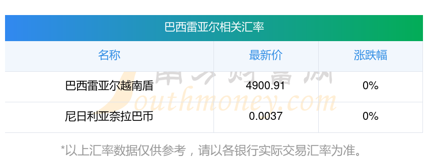 南方財富網(wǎng)為您提供巴西雷亞爾對越南盾匯率最新價格詳情。