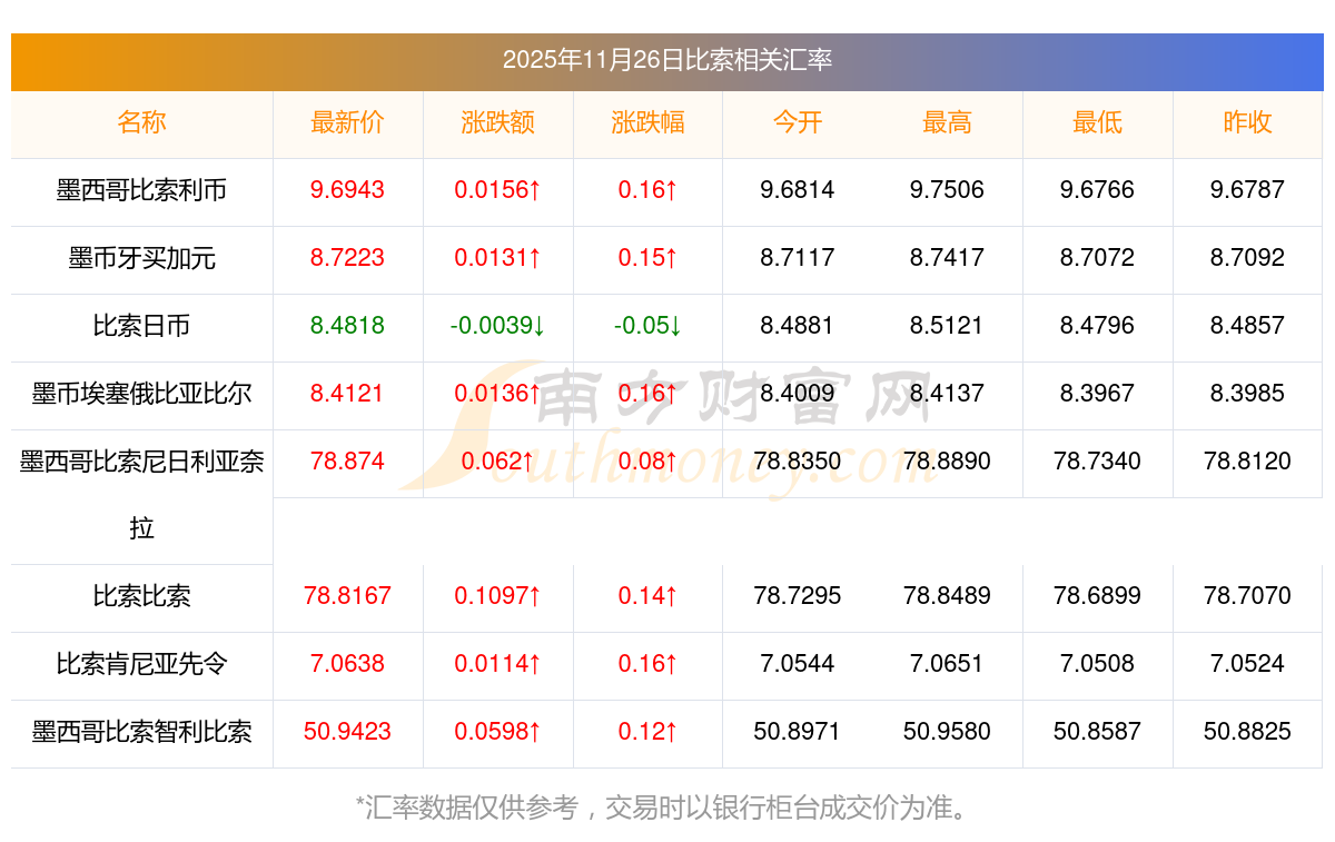 根據(jù)2025年11月26日匯率計(jì)算,比索兌換比索匯率最新價(jià)78.816700,今開價(jià)78.7295,昨收價(jià)78.7070,最高價(jià)78.8489,最低價(jià)78.6899。