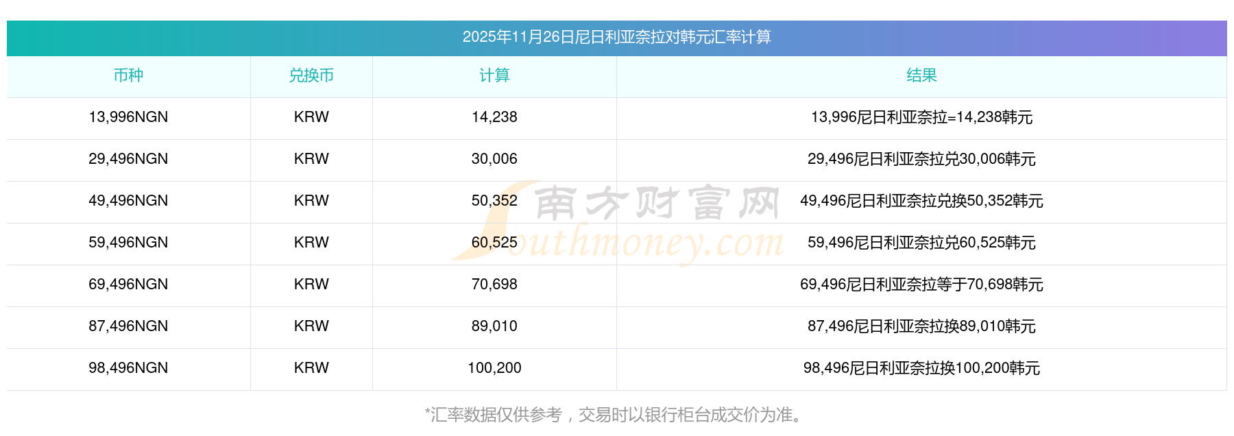 今日計算匯率 尼日利亞奈拉對韓元匯率多少11月26日