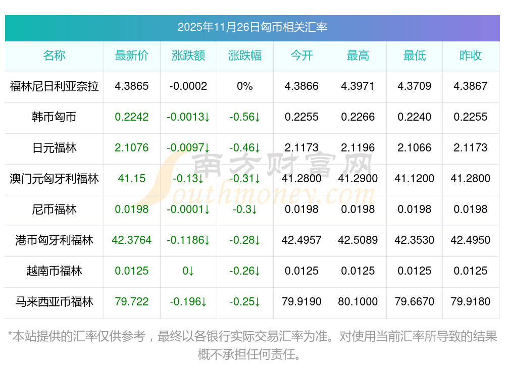 根據(jù)2025年11月26日匯率計(jì)算,HUF兌換CZK匯率最新價0.063247,今開價0.0632,昨收價0.0632,最高價0.0633,最低價0.0632。