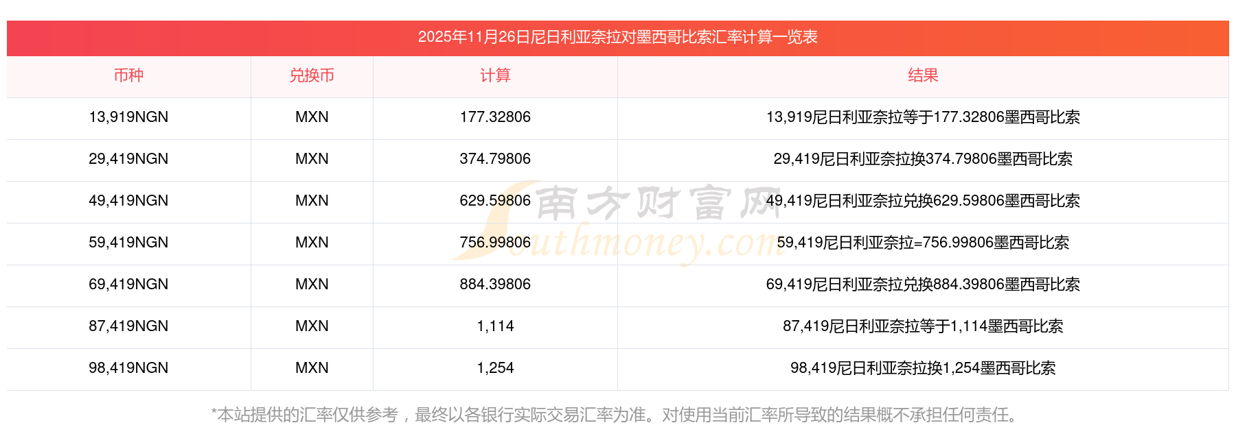 2025年11月26日匯率換算:50尼日利亞奈拉對換墨西哥比索匯率是多少?