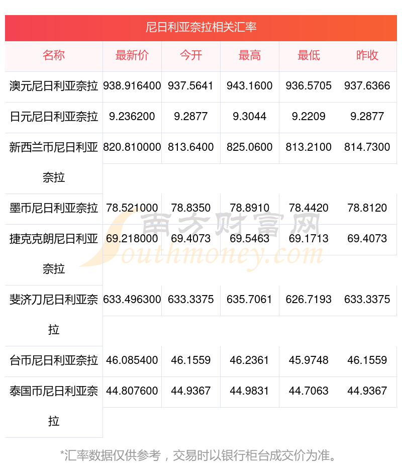 2025年11月26日最新消息,尼日利亞奈拉兌換雷亞爾最新匯率為0.003730,今開為0.0037,昨收為0.0037,最高為0.0037,最低為0.0037。