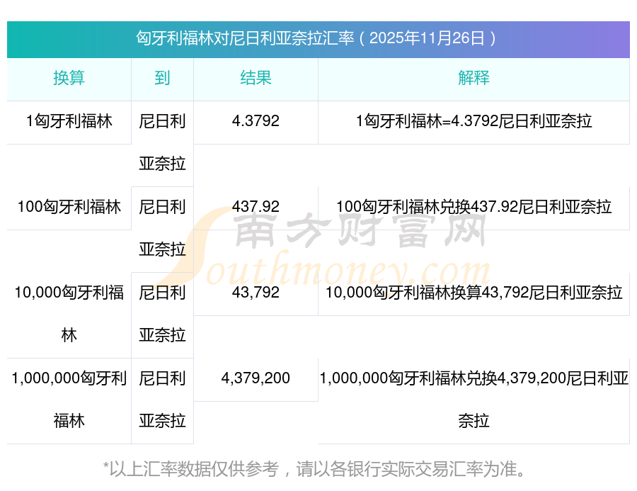 南方財(cái)富網(wǎng)為您提供匈牙利福林對(duì)尼日利亞奈拉匯率最新價(jià)格詳情。