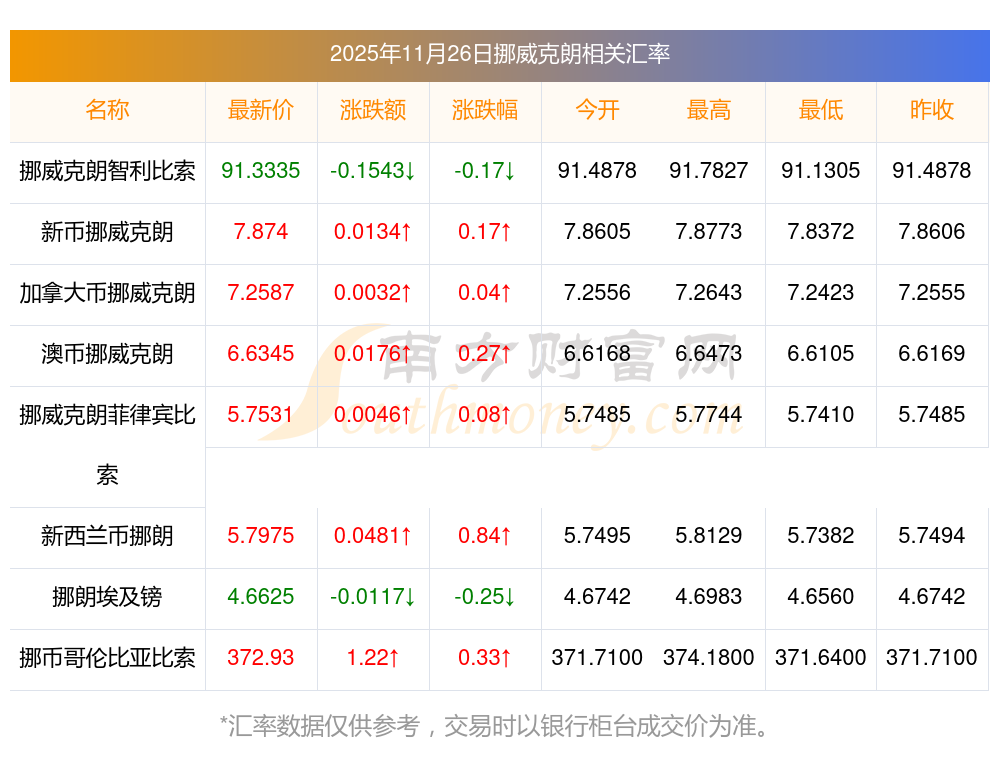 根據(jù)2025年11月26日匯率計算,挪威克朗兌換秘魯新索爾匯率最新價0.329870,今開價0.3296,昨收價0.3296,最高價0.3309,最低價0.3292。