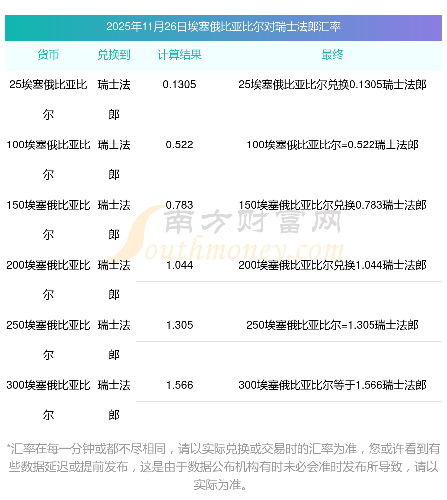 現(xiàn)48埃塞俄比亞比爾兌換瑞士法郎結(jié)匯行情 埃塞俄比亞比爾匯率報(bào)價(jià)查詢11-26