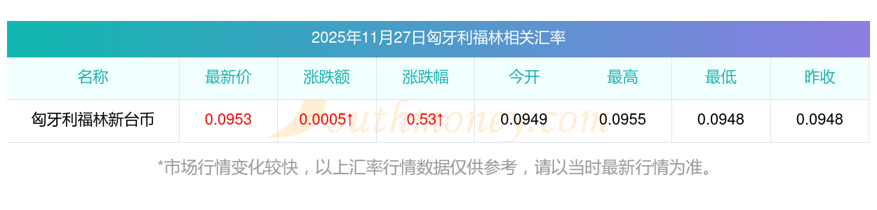 根據(jù)2025年11月27日匯率計(jì)算,HUF兌換TWD匯率最新價(jià)0.095300,今開價(jià)0.0949,昨收價(jià)0.0948,最高價(jià)0.0955,最低價(jià)0.0948。