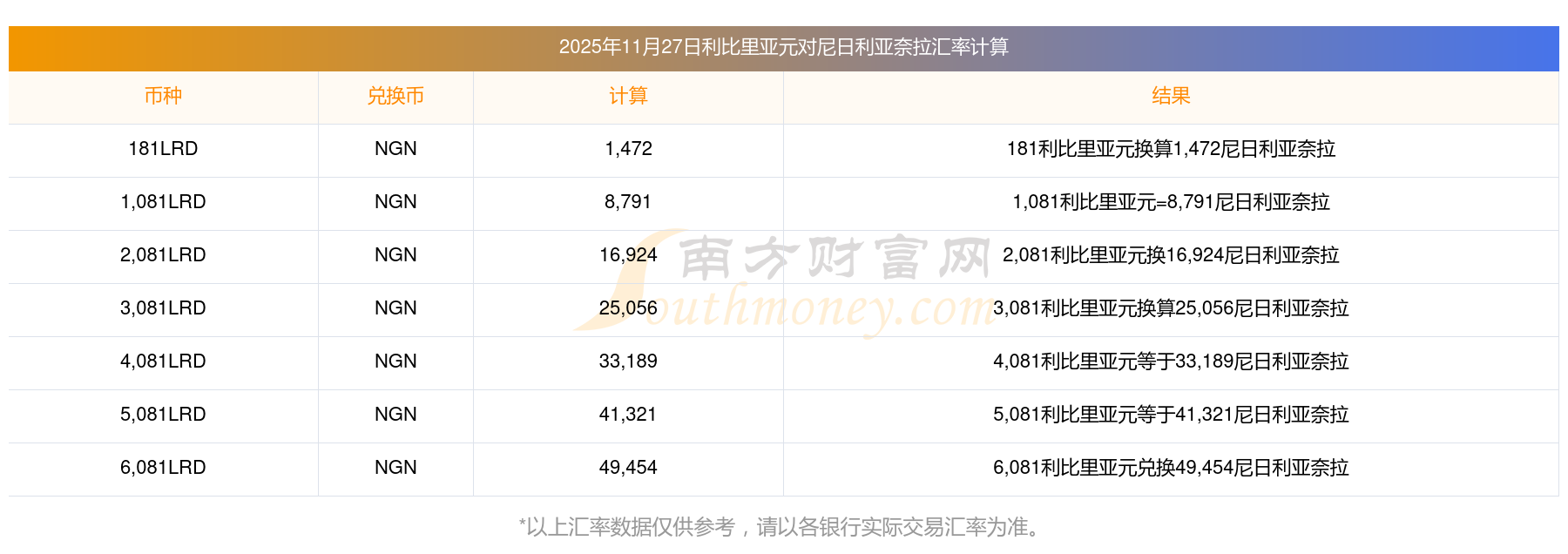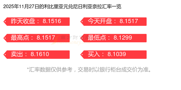 今天利比里亞元與尼日利亞奈拉賣出價(jià)是多少(2025/11/27)
