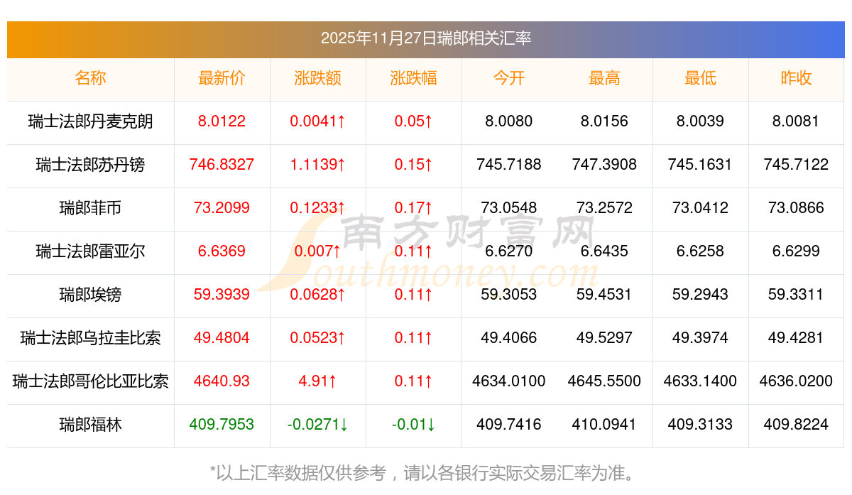 2025年11月27日瑞郎相關(guān)匯率查詢