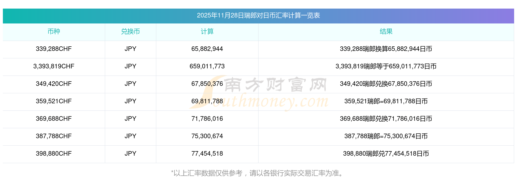 今天瑞士法郎匯率行情 瑞士法郎對日元匯率多少?2025/11/28