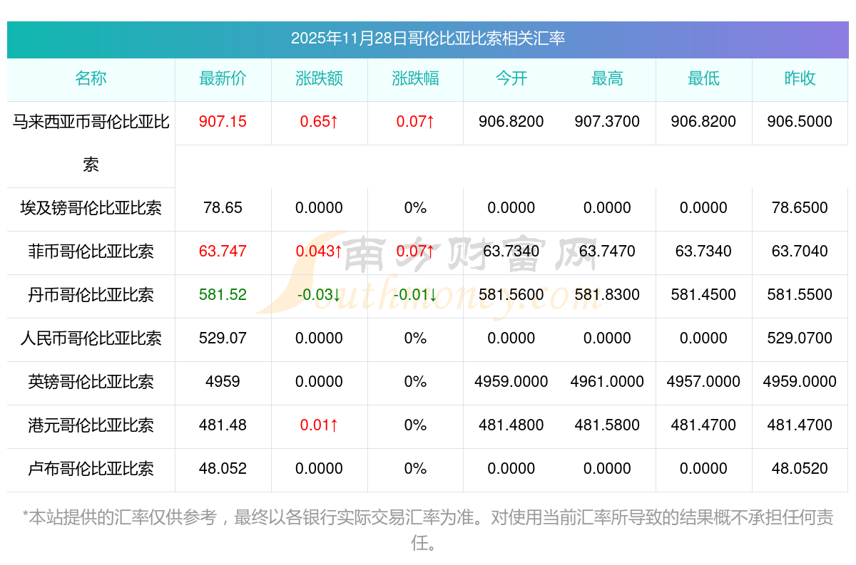 2025年11月28日哥倫比亞比索相關(guān)匯率查詢(xún)