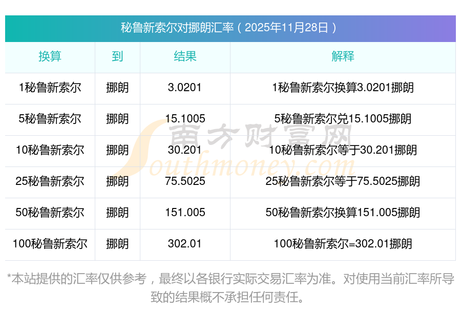 南方財富網(wǎng)為您提供秘魯新索爾對挪朗匯率最新價格詳情。