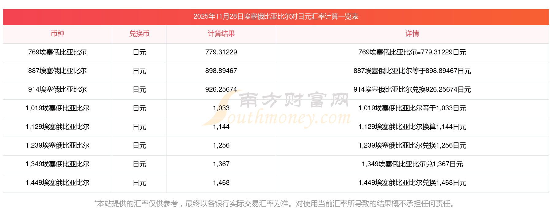 2025/11/28埃塞俄比亞比爾與日元兌換一覽