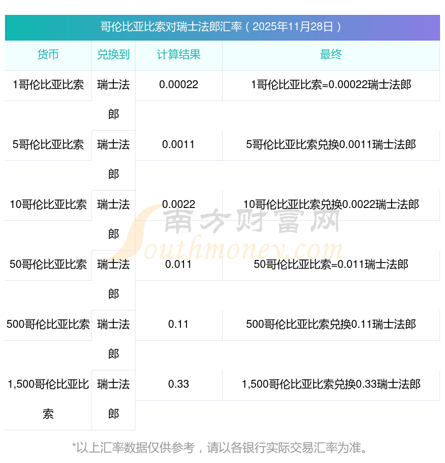 南方財(cái)富網(wǎng)為您提供哥倫比亞比索對(duì)瑞士法郎匯率最新價(jià)格詳情。
