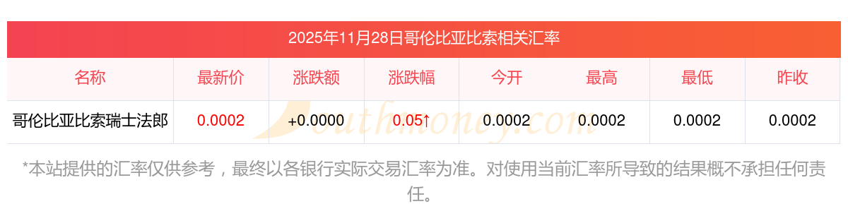 今日27哥倫比亞比索兌換瑞士法郎匯率查詢多少? 11-28