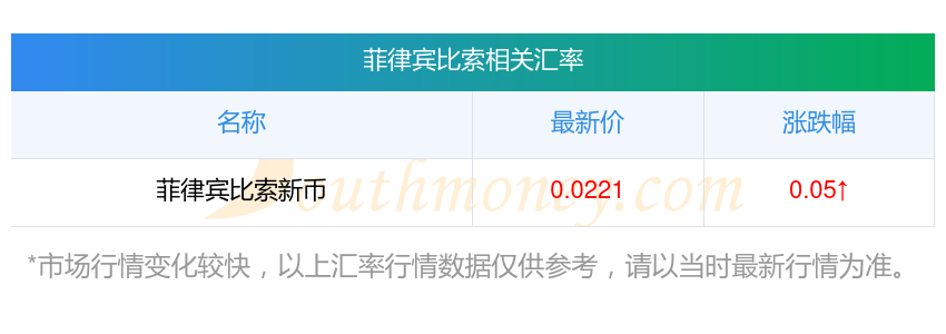 南方財(cái)富網(wǎng)為您提供菲律賓比索對(duì)新幣匯率最新價(jià)格詳情。
