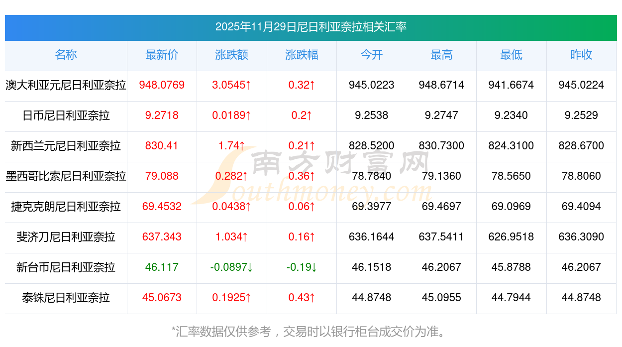 2025年11月29日尼日利亞奈拉相關(guān)匯率查詢
