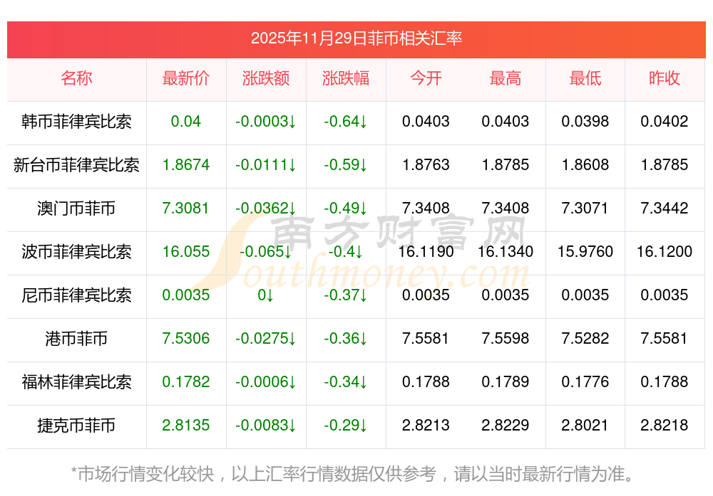 根據(jù)2025年11月29日匯率,菲幣兌換智利比索匯率最新15.830000,今開15.8300,昨收15.8300,最高15.8830,最低15.7750。