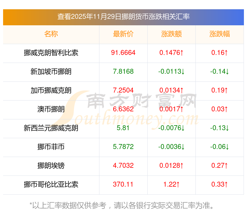 根據(jù)2025年11月29日匯率,挪朗兌換比索匯率最新價(jià)143.142100,今開價(jià)142.7620,昨收價(jià)143.1421,最高價(jià)143.5601,最低價(jià)142.1342。