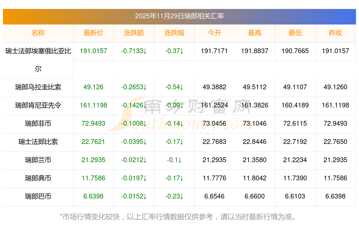 2025年11月29日瑞郎相關(guān)匯率查詢