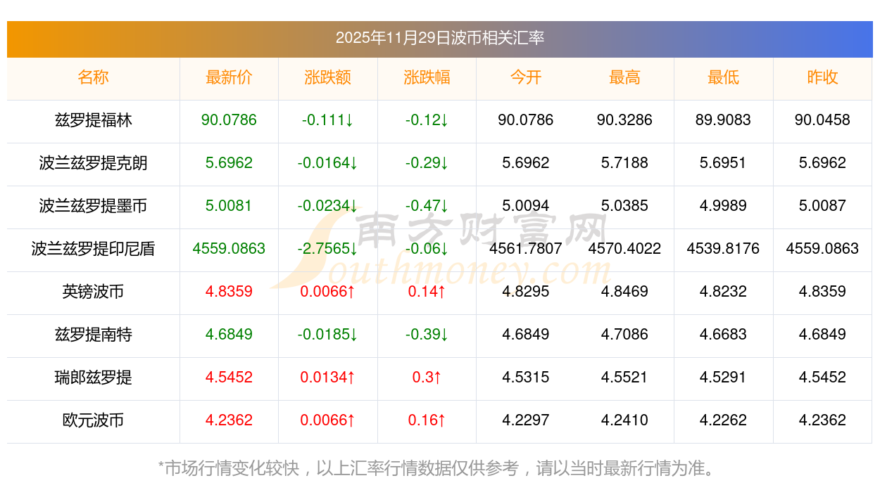 根據(jù)今天2025年11月29日匯率計(jì)算,PLN兌換BRL匯率最新價(jià)1.460900,今開(kāi)價(jià)1.4685,昨收價(jià)1.4609,最高價(jià)1.4698,最低價(jià)1.4545。