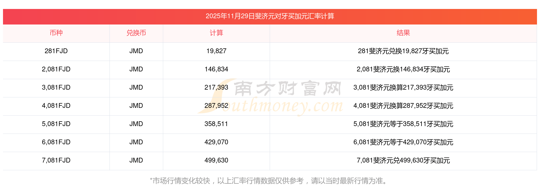 今日外匯行情 斐濟(jì)元兌換牙買加元今日匯率是多少11-29