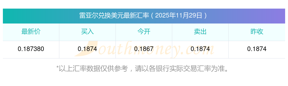 2025年11月29日,匯率換算:1雷亞爾=0.18738美元。舉例:假如一瓶礦泉水需要1雷亞爾,則需美元:0.18738美元。