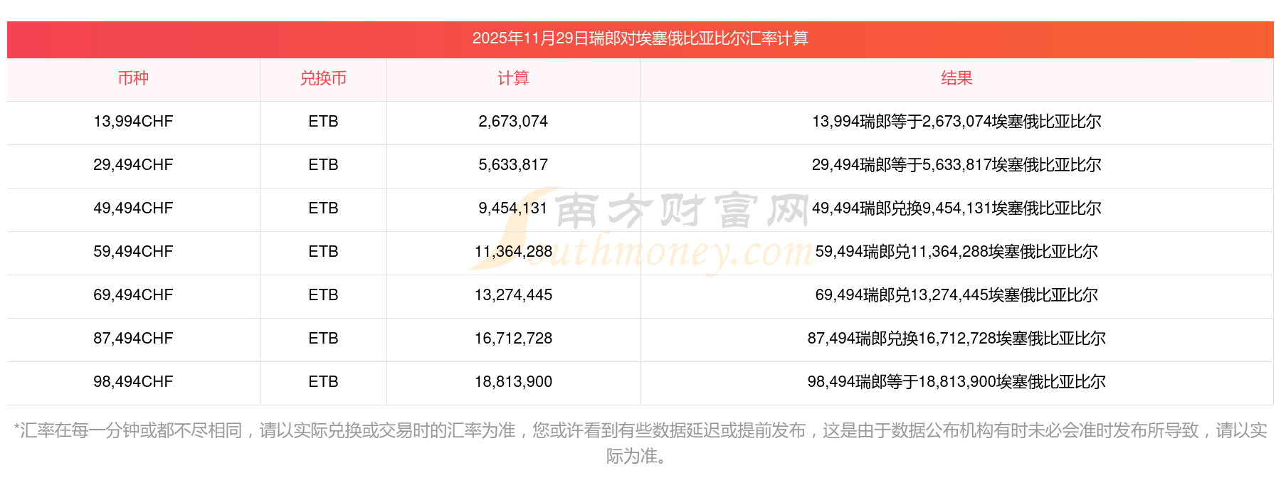 南方財(cái)富網(wǎng)為您提供瑞郎對(duì)埃塞俄比亞比爾匯率最新價(jià)格詳情。