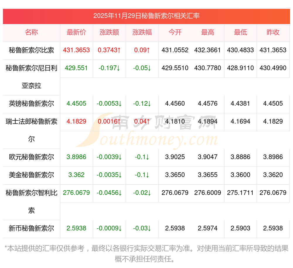 現(xiàn)在秘魯新索爾與尼日利亞奈拉兌入匯率多少?(2025-11-29)
