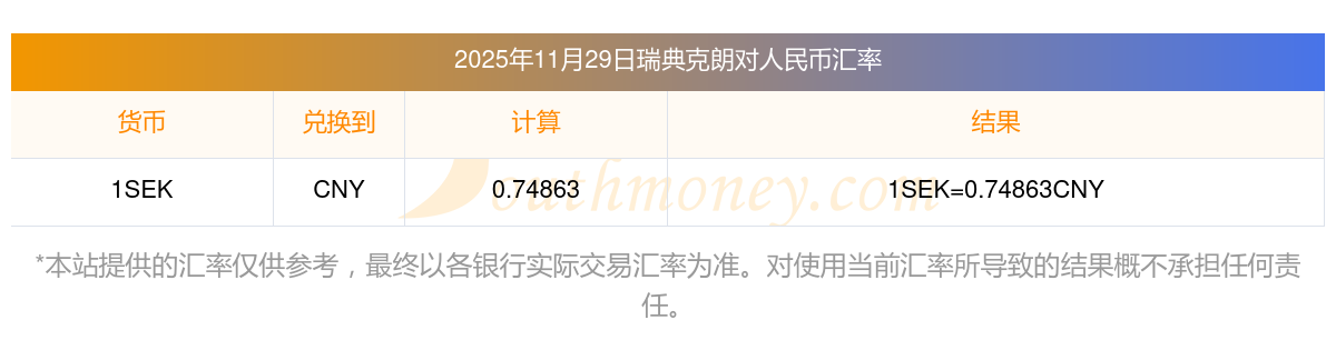 2025年11月29日瑞典克朗與人民幣的兌換匯率計算如下: