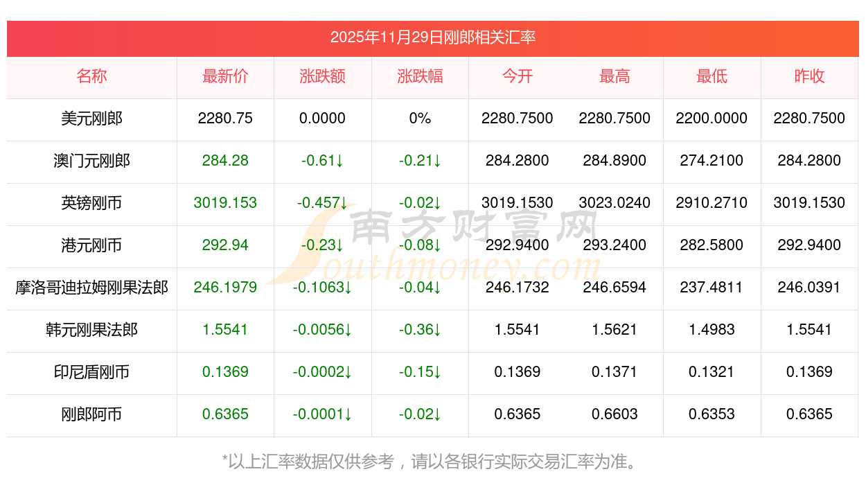根據(jù)2025年11月29日匯率,剛郎兌換雷亞爾匯率最新價(jià)0.002342,今開(kāi)價(jià)0.0023,昨收價(jià)0.0023,最高價(jià)0.0024,最低價(jià)0.0023。
