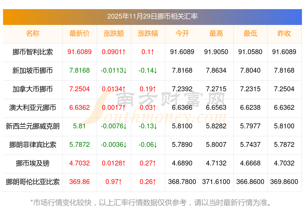 2025年11月29日挪幣兌換烏拉圭比索最新匯率:3.897200,今開:3.8972,昨收:3.8972,最高:3.9323,最低:3.8956。